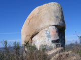 Eventually, we came to another T and to the left we could see someone on a large (20 – 30 feet?) boulder at a peak and who was throwing rocks off it. We thought that we would go to the right because it seemed like the correct way to Mt. Woodson summit. We couldn’t see the antennas but trusted our instincts. As we proceeded toward the peak, we eventually were passed by a group of six young people. A few minutes later we saw them ahead and one person was standing at the edge of Potato Chip rock. From my perspective, the rock was so thin that it wouldn’t support its own weight. We continued on past them and soon made it to the summit. What a view! And no camera! 🙂