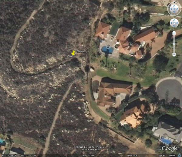 Yesterday afternoon, we hiked Poway’s Western Ridge Trail that runs at times along the border of Poway and San Diego. We were hiking from the south and paused to enjoy the view just as we reached the top of the hill (Google Earth). I heard a buzzing sound that I recognized as bees but wasn’t focusing on it as I was taking in the view. Finally, I looked to see where the bees were and then I saw that I was by a hive in the rocks with an entrance just a few feet from me. I watched a bit as the steady streams of bees entered and left the hive and then we moved on. Brandy had been patiently waiting.
